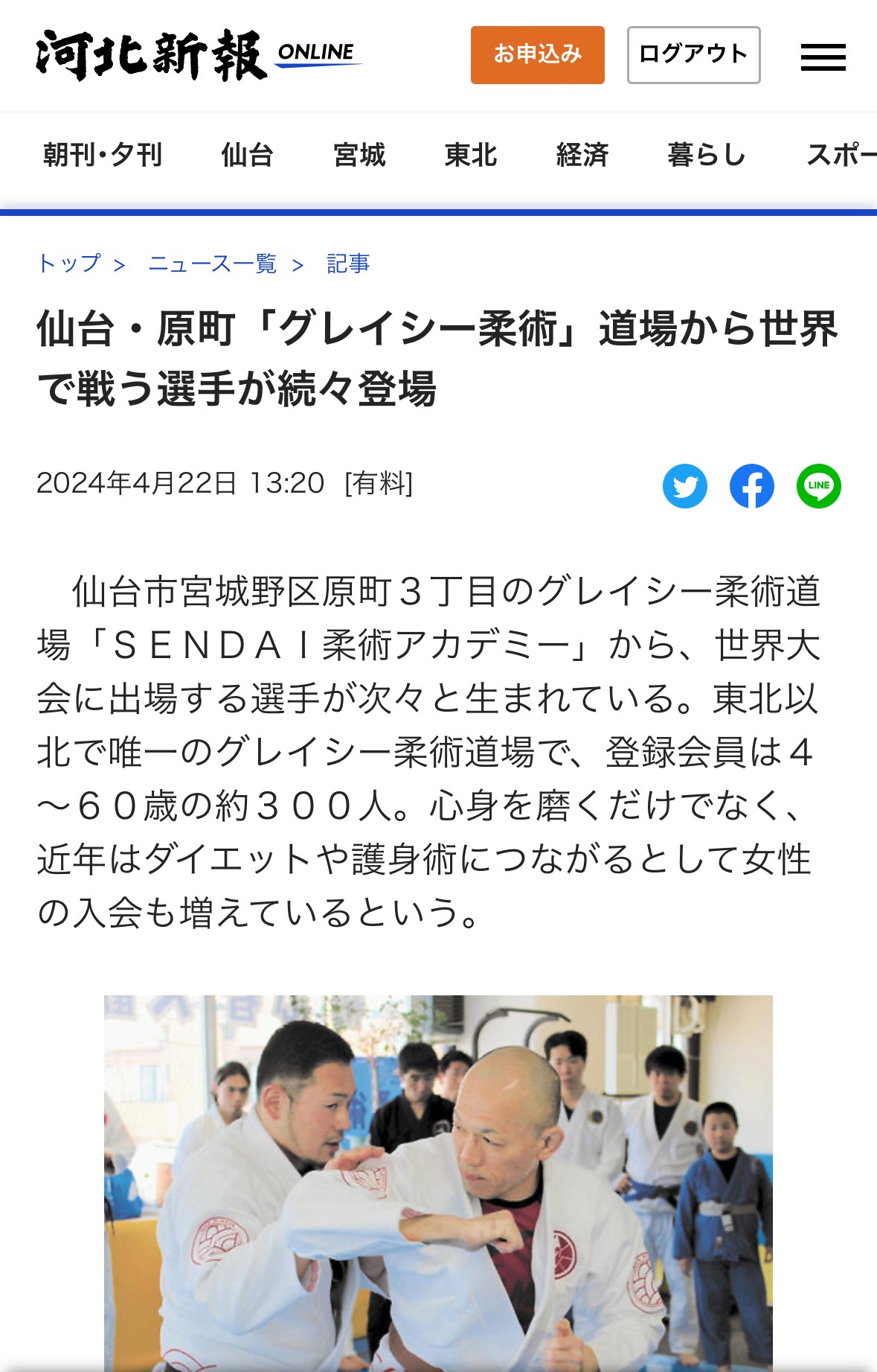 2024年04月23日【2024年4月23日】河北新報オンラインに記事が掲載されました。河北新報オンラインにSENDAI柔術アカデミーについて記事が掲載されました。詳細記事は下記をクリックしてご覧ください。https://kahoku.news/articles/20240422khn000007.html