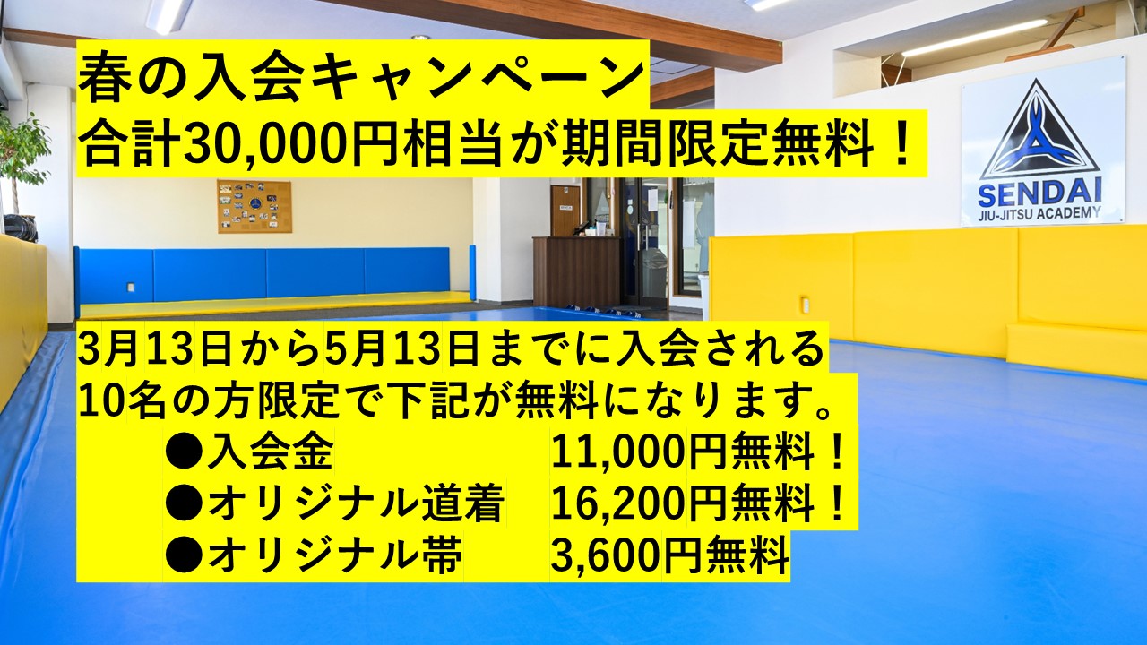 2024年03月13日春の入会キャンペーン 合計30,000円相当が期間限定無料!SENDAI柔術アカデミー春の入会キャンペーンを期間限定で行います。 3月13日から5月13日までに入会される方、限定10名に下記が無料になります。●入会金 11,000円 無料!●オリジナル道着 16,200円 プレゼント!●オリジナル帯 3,600円 プレゼント!春から柔術をスタートされる方を応援させて頂きます。ぜひこの機会に新しい趣味として、ライフスタイルとして柔術を生活に取り入れてみてください。まずは見学・無料柔術体験にお気軽にお越しください。